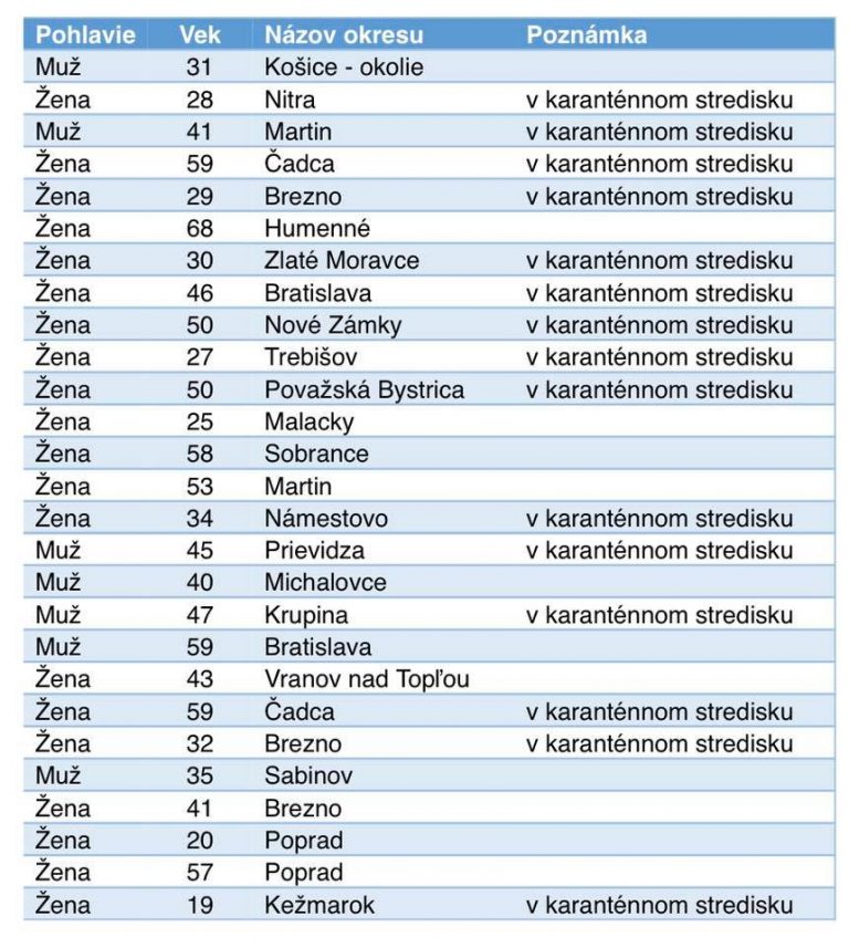 Na Slovensku za uplynulý deň (nedeľa) pribudlo 27 nových prípadov ochorenia COVID-19 (koronavírus), celkovo máme 769 pozitívnych ľudí. Laboratóriá vyšetrili 1324 vzoriek, z toho 1297 bolo negatívnych. Počet testov s negatívnym výsledkom tak na Slovensku dosiahol 27 981.