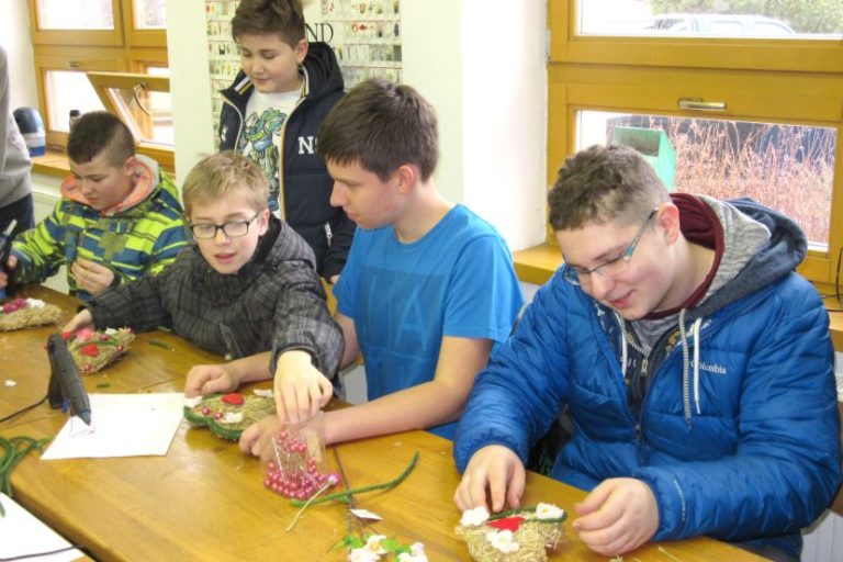 „Nachádzame sa vo floristickej dielni, kde naši študenti pripravili materiál na výrobu valentínskych srdiečok. Deviataci, ktorí sem prichádzajú, si môžu vyskúšať svoju tvorivosť i invenciu. Vytvárajú podľa svojich predstáv a fantázie vlastnú valentínku. Na srdiečko z kartónu, ktoré naši študenti obložili prírodným materiálom, senom a upevnili drôtom, si prikladajú pripravené sušené kvety, ozdoby, aplikácie. My ich usmerníme, poradíme a tiež poučíme, ako dielo dotvoriť a dokončiť. Platí zásada menej je vždy viac, preto im radíme, aby pri zhotovovaní nepoužívali viac farieb ako tri,“ skonštatovala majsterka Beáta Mičkyová. Pri pracovných stoloch sa striedali deviataci zo Starej Turej, Vrbového či Rakovíc.