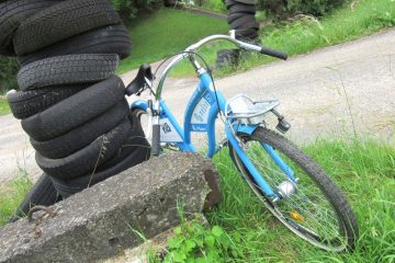 Defekt na prednom kolese, uvoľnené riadidlá preklopené ku kostre bicykla, sedadlo naklonené šikmo. Takto odpočíval opretý o komín z pneumatík…