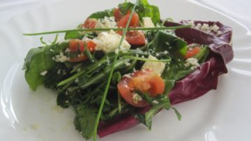 150 g rukola, 150 g baby špenát, 250 g cherry paradajky, 1 kávová lyžička (KL) balzamikového octu, 1…