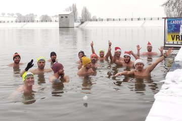 Milovníci studenej vody z mestečka pod šikmou vežou nasadili tematické čiapky a s radosťou vbehli do vody. Ľadové medvede Vrbové…