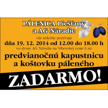 Pálenica Piešťany a AG náradie vás srdečne pozývajú 19. decembra od 12.00 - 18.00 hod vo dvore AG náradia na…