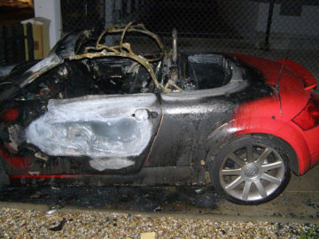 Osobné auto Audi TT Roadster horelo v nedeľu skoro ráno vo dvore rodinného domu v Hlohovci.