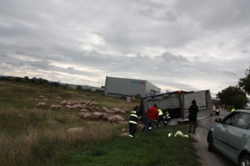 Pravotočivú zákrutu medzi Trebaticami a Krakovanmi nezvládol vodič maďarského kamiónu prevážajúci ošípané.